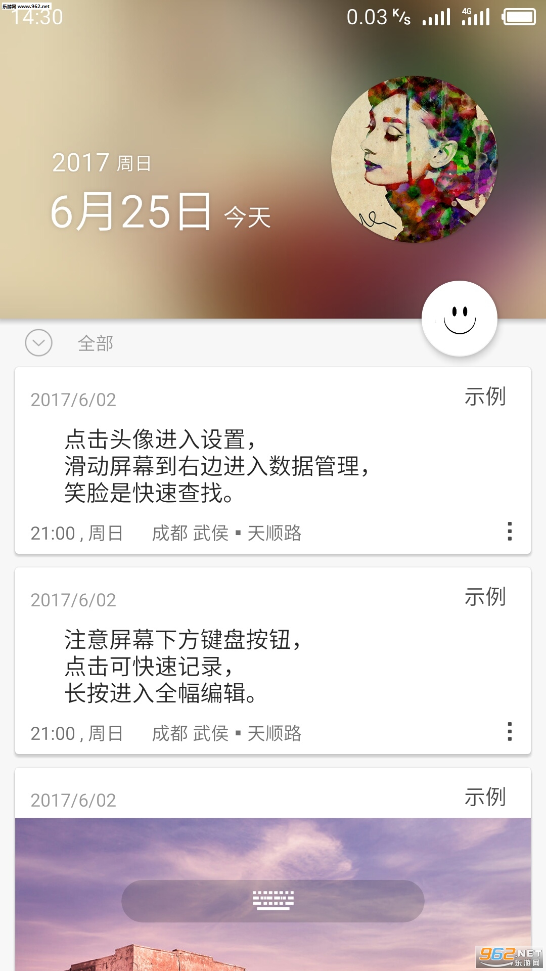 屏幕下方键盘按钮点击可快速记录,长按进入全幅编辑。