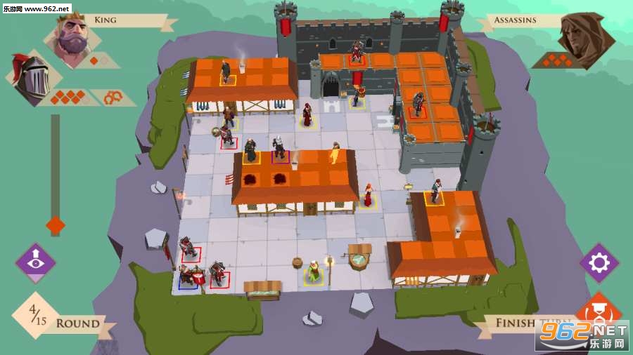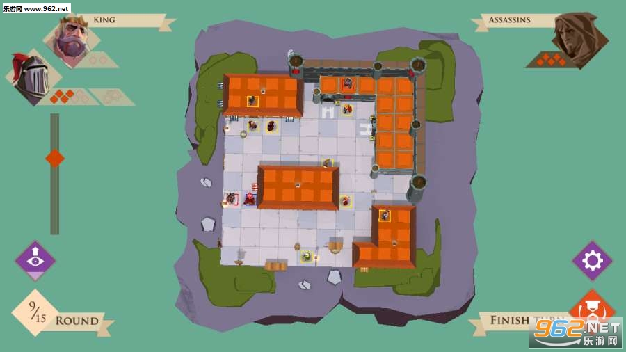 游戏是基于动作卡的,它显示了双方可用的数量有限的动作点。首先,国王和他的骑士们在围城中移动,通过推开人群来保护他们的位置,或者消除危险,然后,隐藏在人群中的刺客们为他们的致命袭击做好准备,杀死守卫,或者让国王的进步更慢。在目前的回合中,球员们应该充分利用这些行动点。国王的球员如果成功地从一个出口中逃出,或者他的骑士消灭了所有的刺客,他就赢了。如果刺客杀死国王,他会用两伤或者拖延时间来杀死国王,这样一来,行动卡牌就会被耗尽。