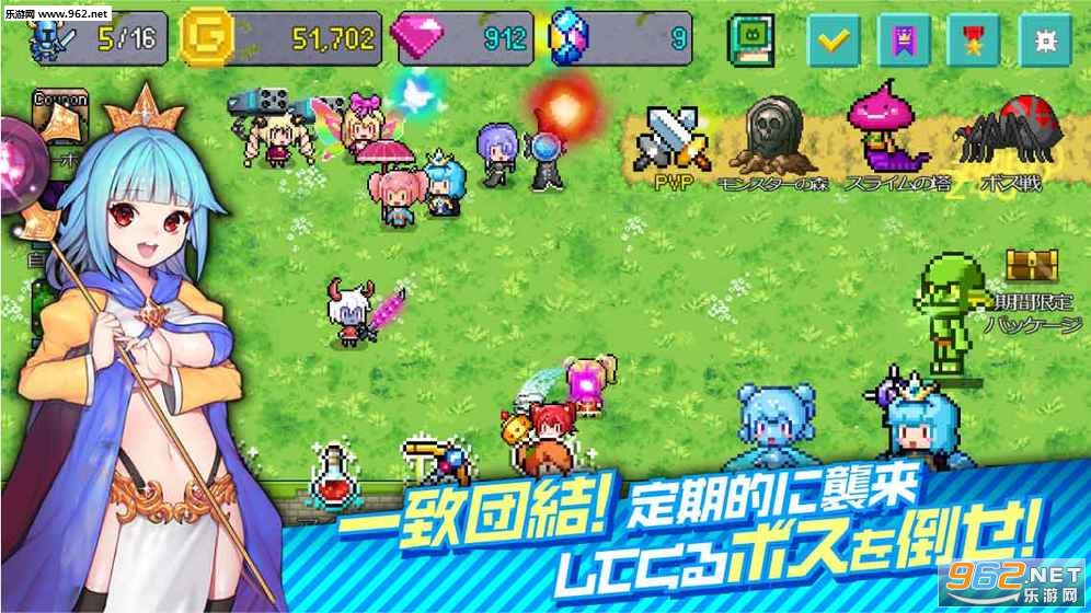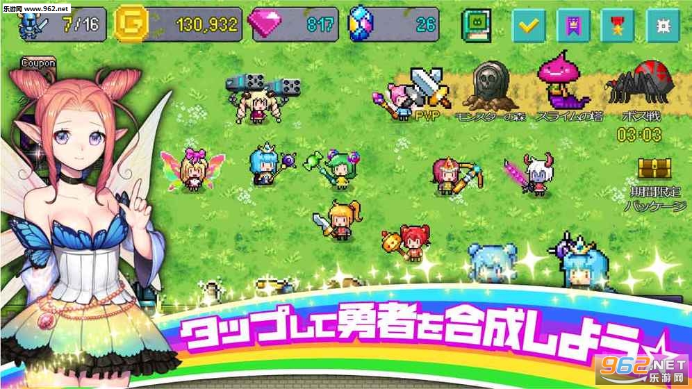 登场勇者全员都是可爱的女孩子,玩家可以轻松合成勇者,带领她们和敌人战斗。除普通合成外,还能通过2人以上的同种勇者,召唤出新的勇者,或利用召唤石,召唤「稀有勇者」!