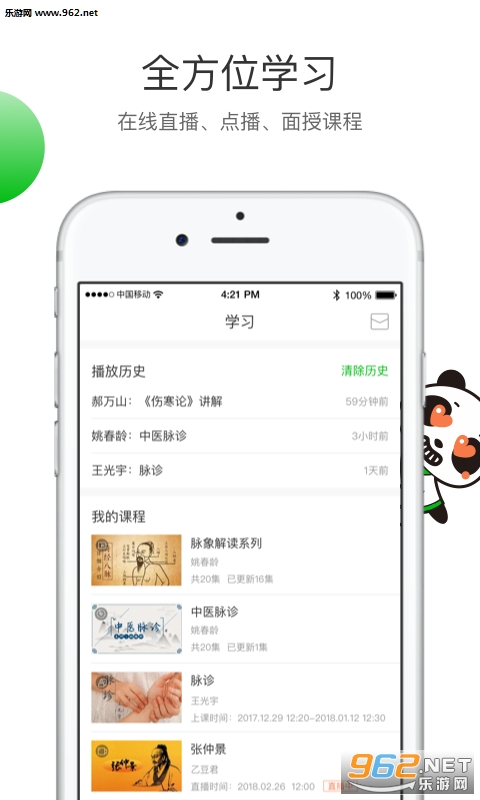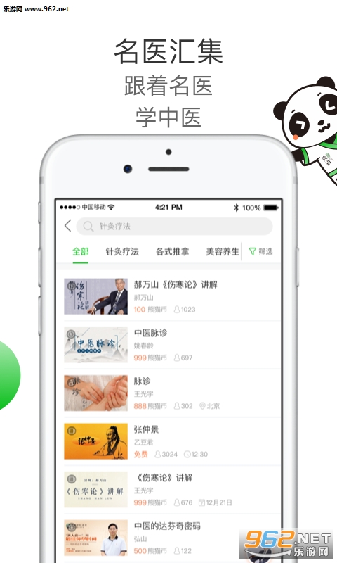 熊猫中医是中医药的学习直播平台:学中医、懂中医、用中医,让中医服务于家庭、个人,让中国古代科学瑰宝为现代人类的健康保驾护航;