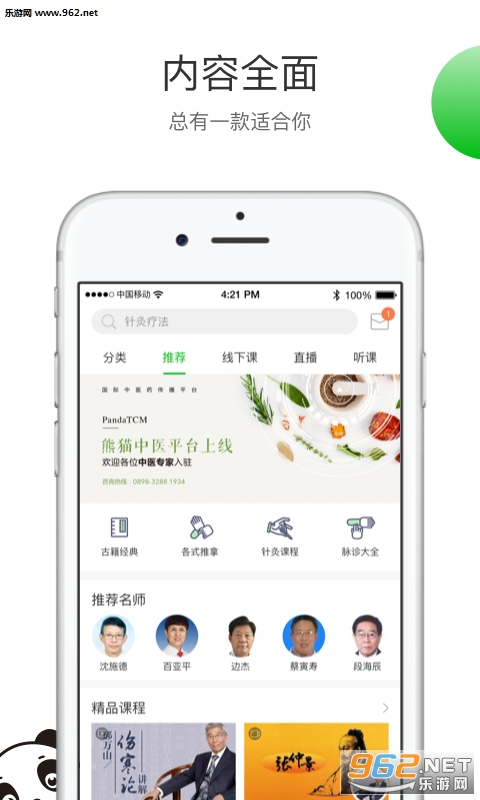 中医从业者,可以从这里找到名师课程,获得跟师学习的机会,课程有线上、直播和线下课,多方位的跟师学习;爱好者:有中医入门、养生健身的课程可以进入中医的门槛。