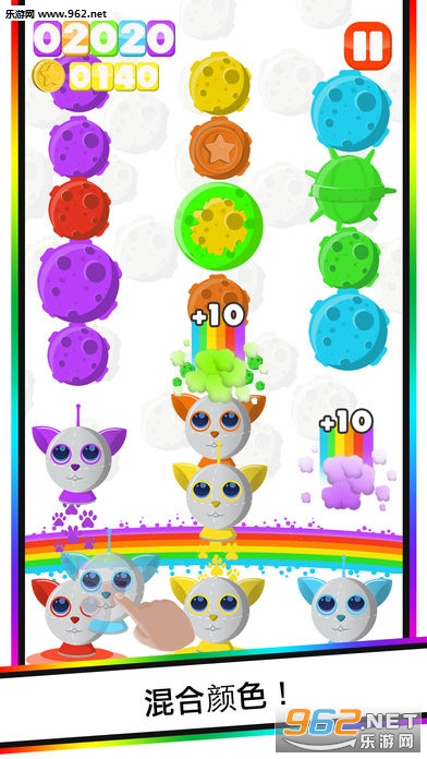 不过什么呢?除了直观的“红黄蓝”三种颜色之外,其实颜色混合才是本作的主打。用开发商的话来说,本作的初衷就是让你在色彩鲜艳的环境里面进行各式操作,一方面挑战你的反应力,一方面锻炼你在压力环境下的快速思考能力。譬如当屏幕上出现绿色的行星时,你需要快速将彩虹下面的蓝色火箭与黄色火箭进行融合,让它们变成绿色,然后再点击火箭向绿色的行星发起攻击。而后续的紫色行星和橙色行星的破解办法,同样也需要先进行颜色混合。