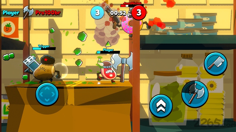 食品题材的冒险闯关动作游戏,游戏中将会以不同的食物为角色并为你打造了精彩刺激的竞技冒险元素,你要在其中感受到有趣且休闲的战斗过程,并通过匹配两两一组和敌人对战,而且需要注意的是游戏拥有限定时间,你要在有限的时间内获得更高的积分才能获胜。
