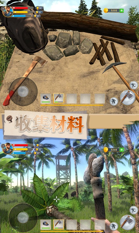 玩法非常自由,在解决食物和水的情况下建造各种能帮助你生存的物品,多收集木材和石头等材料。