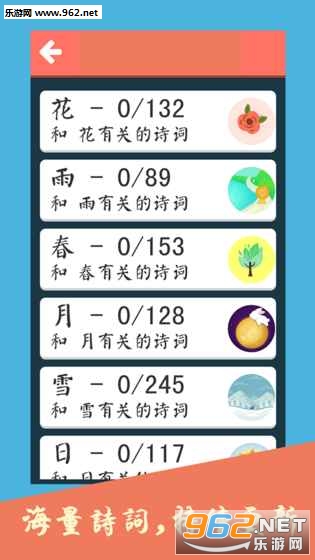 《中国诗词大会飞花令游戏》是一款诗词记忆力类手游,在前段时间非常火爆的飞花令你还记得吗?在综艺节目中国诗词大会上涌现了一大批热爱中国诗词的人群,他们的记忆力也是惊人的,而飞花令环节也是非常考验功底的,你可以回答到多少呢?