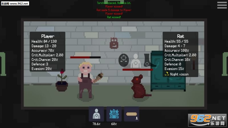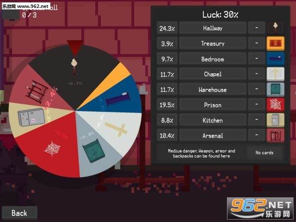 这是一个角色扮演游戏,随机的水平和随时都有可能死亡。游戏关卡包含不同类型(厨房,卧室,等)的房间。一些房间是未知的,这个游戏是一款随机冒险的游戏,游戏中的很多东西都是随机的,地图也是随机的,非常的有挑战性。