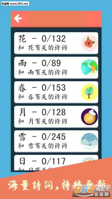 诗词飞花令,包括了上千条古诗词,根据描述事物的不同将诗词分类,请你将诗词连起来。