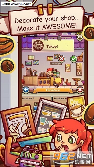 你可以把这里当做是你自己开的店一样,所以你也可以发明新的食谱、改变价格和产品来获得更大的利润、购买装饰来改变你的咖啡店设计!快来试试吧!