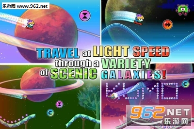 游戏操作比较新颖,玩家按住屏幕右下角的按键,主角就会下蹲做出加速前进的动作,当加速越过轨道的弧度时,看准时机松开按键,主角就会获得前进的动力。利用这种加速和伸展的循环,不断在波浪形的宇宙中跳跃甚至飞行在空中。除了那些该收集的东西,有些危险性障碍会让你瞬间功亏一篑。比如在加速前进中碰到陨石和外星人,你会失去大部分速度,空中隐藏着很多尖刺方块,当你蹦得正嗨的时候常常会突然给你来一发。跑酷过程中最烦的就是这种难以预测也难以掌控的“宇宙断层”,只要落点掌握得不好,或者在跳跃的时候速度不够,你就会直接坠落成宇宙的尘埃。
