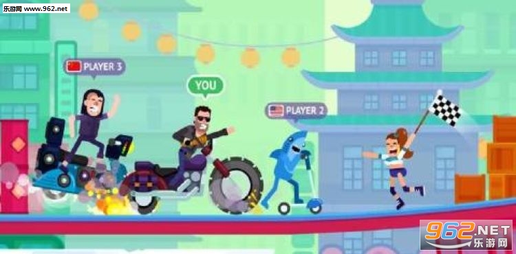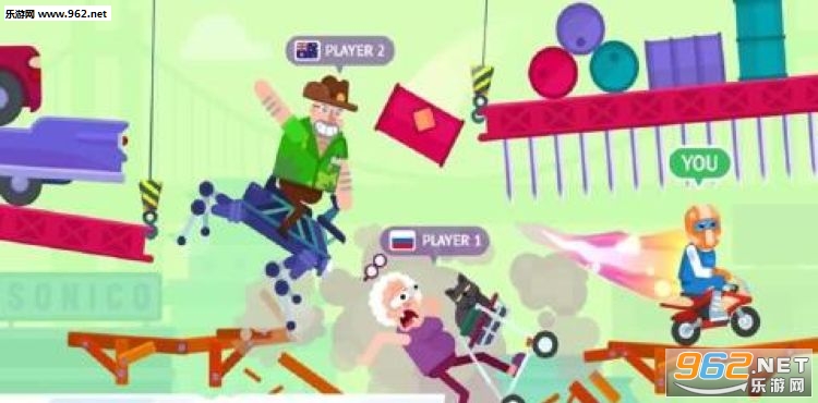 疯狂的人物正在进行比赛,他们驾驶者各种各样的车辆或者是其他的可以移动的工具,想要冲向终点,成为最后胜利的那一个人,你需要操纵其中一个疯狂的人,帮助他成为最后的胜利者。