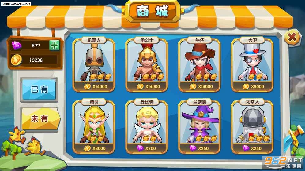 3.商店中有多种像素人偶风格的角色供您选择,角色的加入并不会造成游戏失衡,这是追鸡大作战又一个突出的地方。