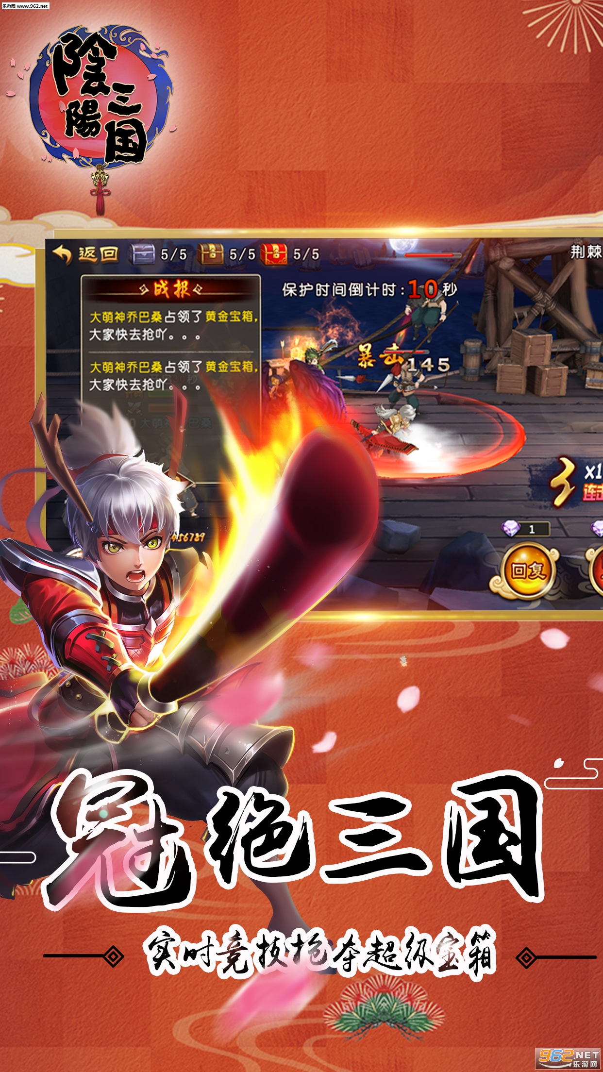 搭配上阵武将,组建最佳阵容,综合连击、奥义、神兽、羁绊等各个因素,不断累积伤害加成。伴随着秒杀全屏的华丽连击与高端视听特效,体验极致真实的热血战斗。