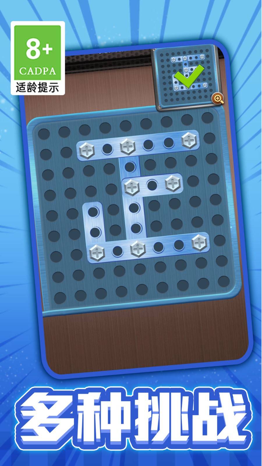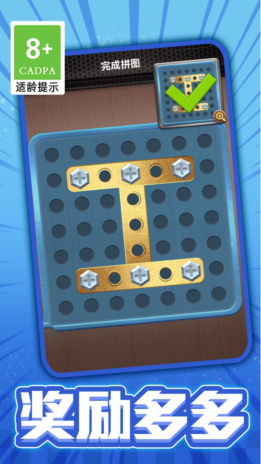 3、完成基础任务后,解锁含有更多螺丝种类和复杂结构的关卡。