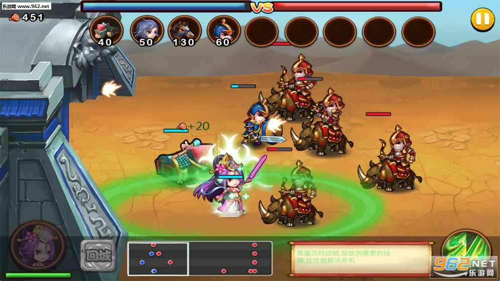 玩家需要以一个指挥者的身份,快速根据当前粮草值、敌人出兵情况、冷却cd等情况决策士兵和英雄的投放以解决危机和抓住机会进攻击破敌人城池。