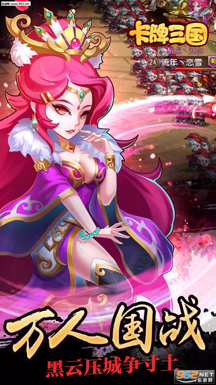 《卡牌三国》全民橙将,真正的卡牌策略游戏!所有的顶级武将和顶级装备都能在游戏内获得,即有诙谐搞笑幽默轻松的剧情,又有真实还原三国战争的千人国战。多样的布阵方式,多兵种的军团排列,还原真实历史的百余座城池,让玩家真正能够体验到三国时期群雄争霸,战火连篇的战斗快感。24小时国战战不停,等你来玩哦!