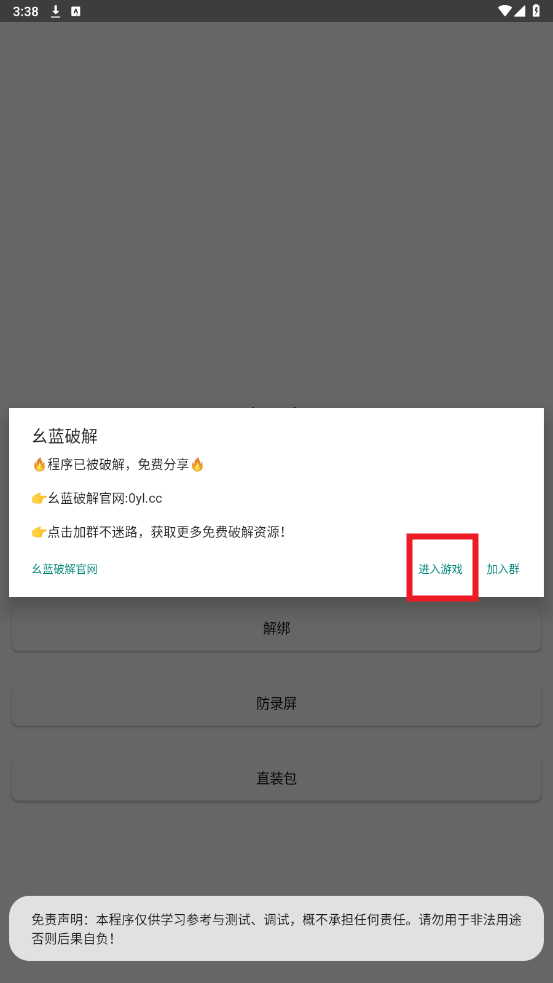 弹出幺蓝破解弹窗,点击进入游戏
