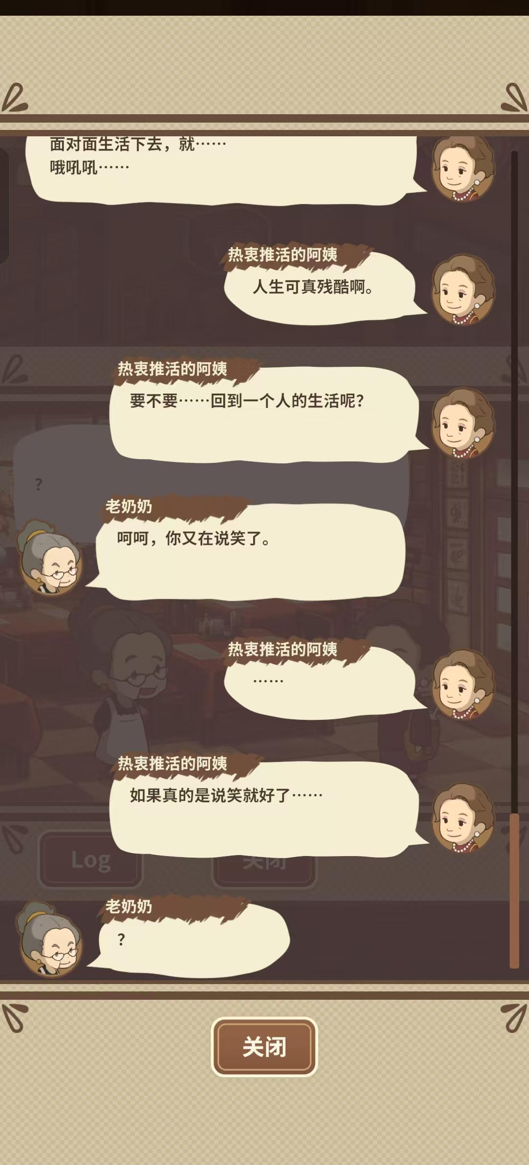 游戏不管是音效也好动画也好人物也好,感觉都很棒,最喜欢的大概就是老奶奶做菜洗碗的声音了吧。平时我玩游戏都会把音效关了,但是唯独这个感觉就不舍的关呢。希望这个游戏能继续更新下去就好啦,最好能再出一个相册之类的功能呢,把所认识到的人们都保留下来,等闲暇时!