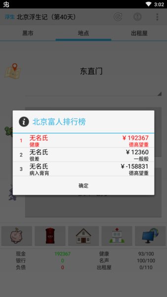 北京浮生记是一款有趣的文字模拟游戏,这款游戏主要是以文字叙述一个外地身无分文的小伙子来到北京谋生,通过自己的才智来赚取钱财,做各种贸易和倒卖生意,通过信息差来赚取差。游戏非常的有意思感兴趣的玩家来玩玩呀!