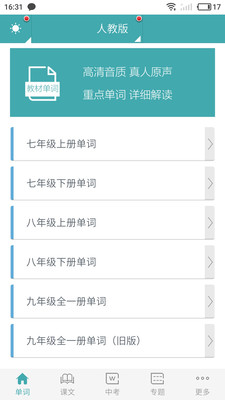 (1)包含七年级到九年级的单词和课文(同步翻译),且都配有高清的真人发音,可跟读、可点读。