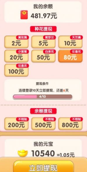 四季养花是一款非常好用的养花经营小游戏,玩法十分简单,玩家可以解锁各种不同的花卉并进行种植,通过完成各种订单任务来领取各种奖励,还可以和你的好友一起交流养花的经验和技巧分享你们彼此的花卉,完成任务的奖励还可以用来装饰你的花园,让它们变得更加精致美丽。