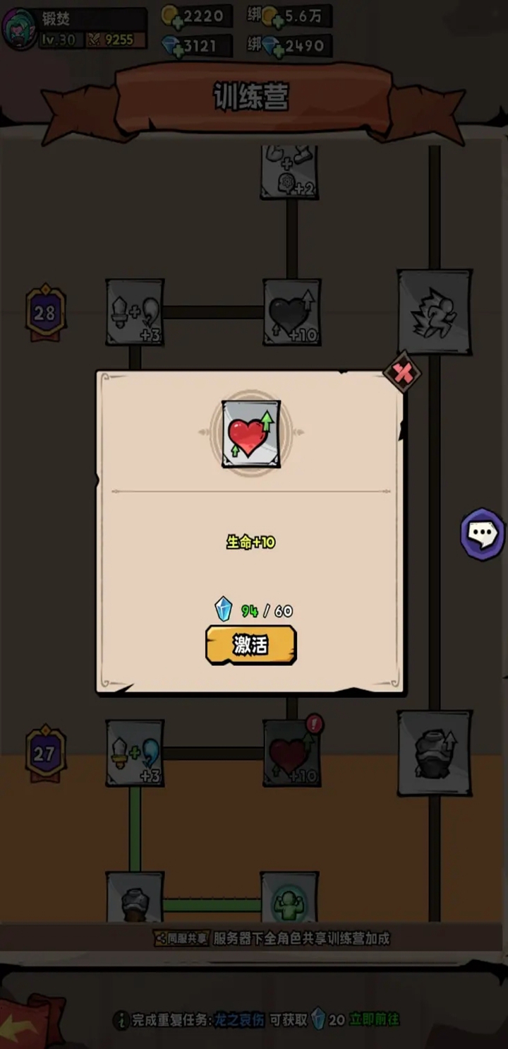 可以查看角色有哪些训练营任务未完成。完成之后不止给我们金币还能有精造石、黑铁残片等其他资源。