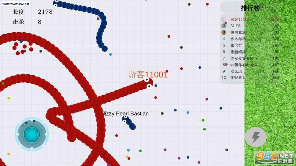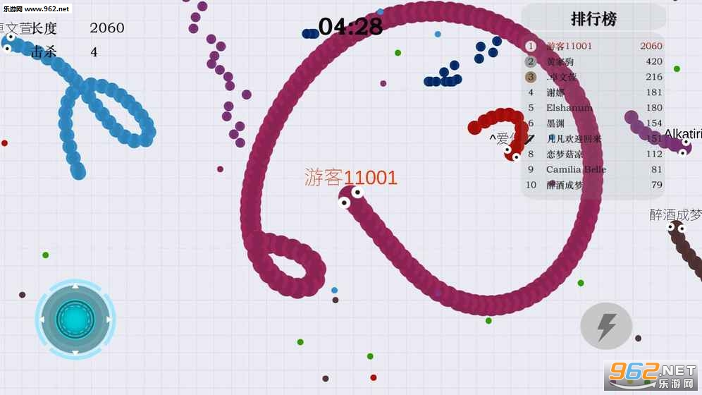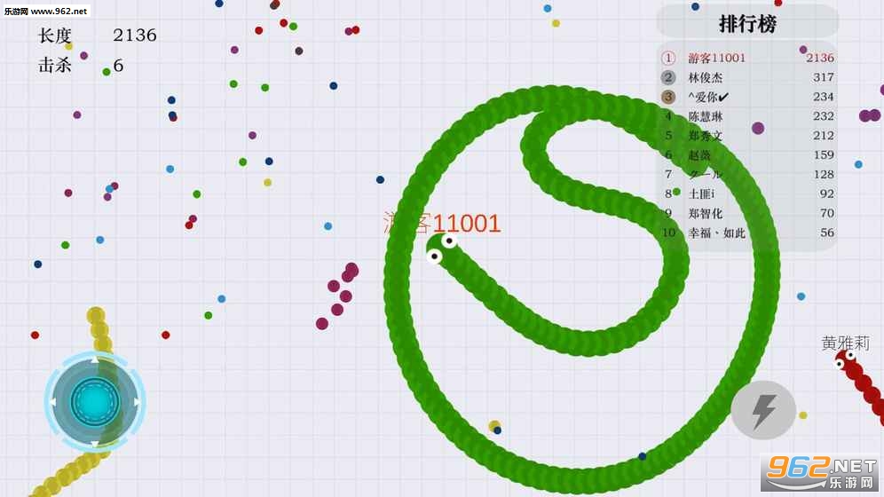 1.拖动摇杆控制小蛇前进方向,吃掉小圆点食物,你会越来越长。