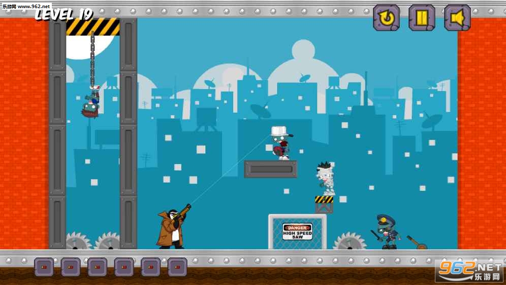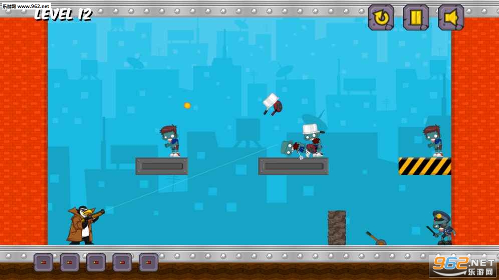 游戏的主题是“杀丧尸”(这可能是网页游戏中最常见最受欢迎的主题之一吧),不过主角是企鹅而不是人类。游戏的玩法采取物理弹射,企鹅先生在每关中都要利用有限的子弹数尽歼所见的丧尸。子弹遇到硬物会反弹,因此如何利用反弹而消灭尽量多的丧尸是游戏的精髓所在。尽歼丧尸所用的子弹越少,则过关成绩越高,当然子弹用完还没有尽歼丧尸就只能重玩了。游戏的玩法尽管颇为常见,但玩起来却又相当有趣,值得推荐一番。