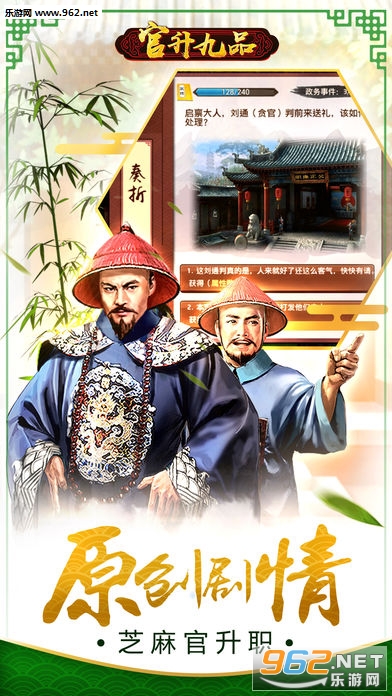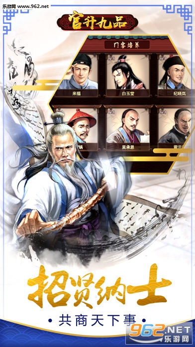 ——在游戏中千古名臣,悉数登场,您可以将他们尽数收入麾下,尽为君用。所谓千军易得,一将难求。那些辉耀千古、武破山河的贤臣名将尽在《官升九品》门客招募系统。有诚心的玩家自可将之招募,为己征战四方。游戏摒弃模式单一的经营玩法,引人入胜的剧情故事,斗智斗勇的玩家对抗,真实模拟的宦海生涯。来一场尔虞我诈的官场争斗,岂不快哉!