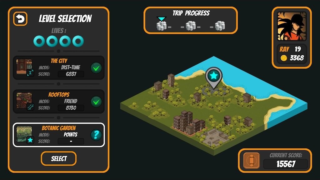 2、通过比赛赢得金币,购买更高级的滑板和装备,提升自己的实力;