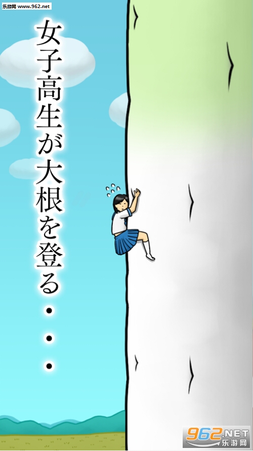 在一个平静闲适的广阔的田园风景中。在那里有一个和画面不相符的女高中生紧紧地抱住了一个大萝卜。女高中生只是一心一意的爬到耸立的萝卜顶上去。为什么要爬上去呢?谁都不知道为什么,女高中生今天也紧紧地抱住了萝卜,想要爬到顶峰。