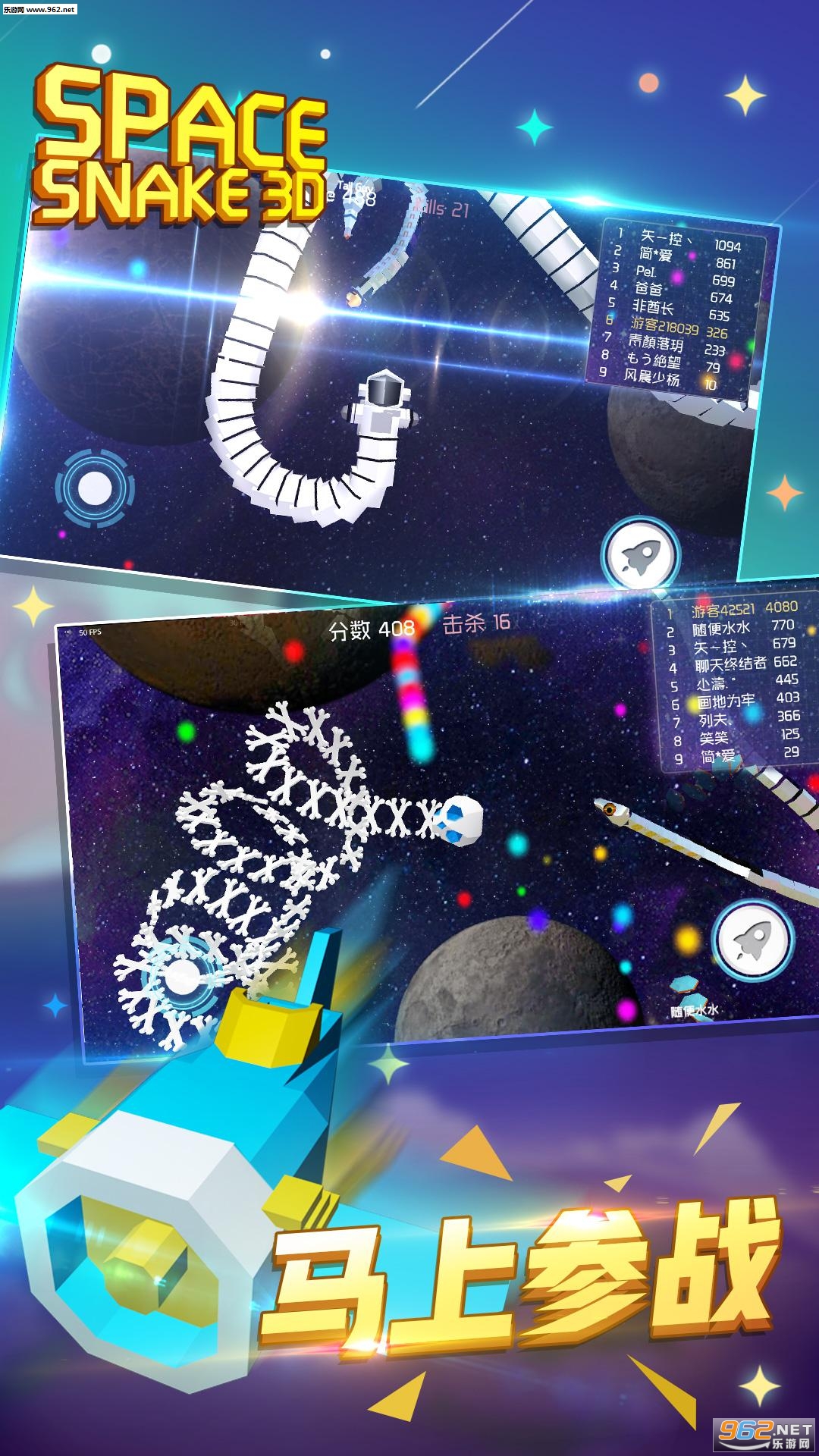 《3D贪吃蛇2026安卓版》是一款多人在线竞技休闲类游戏。游戏玩法类似贪吃蛇大作战,玩家需要操控自己小蛇不断的向前行驶,吃到更多的点点,并且灵活的干掉其他的玩家,吞噬它们,让自己变得更加强大,和以往贪吃蛇类游戏不同的是,此游戏融入了很多太空中的元素,整个游戏的画面也更加立体生动逼真,喜欢的小伙伴快来下载试试吧!