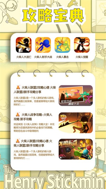火柴人攻略大全app提供了众多火柴人游戏的相关攻略,为需要玩火柴人系列手游的朋友提供了更多参考,为推动游戏或是完成通关提供了有力支持,整合版的特性有效减少了到处查找攻略的麻烦。