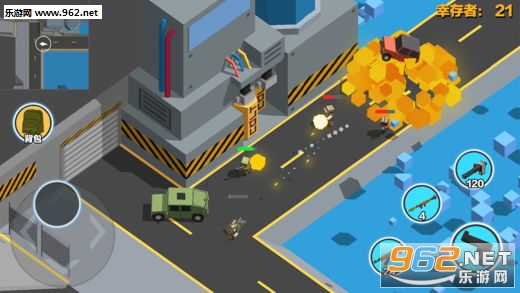 《求生之王:大逃杀》采用3D像素风画面,游戏从人物到场景都非常简洁,游戏视角则放弃了其他写实派游戏的第一视角,而是采用45度俯视的第三人称视角,精简的画面表现让游戏运行非常流畅,并且对会3D眩晕的玩家朋友来说也是很好的体验。当