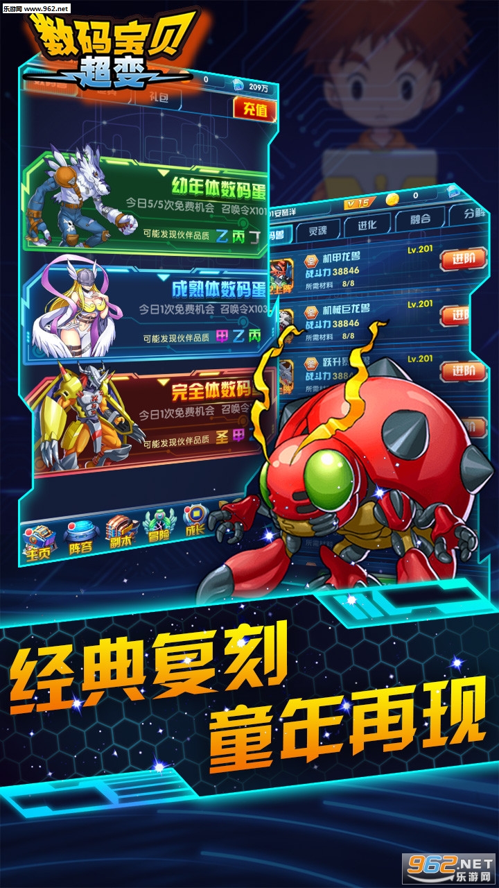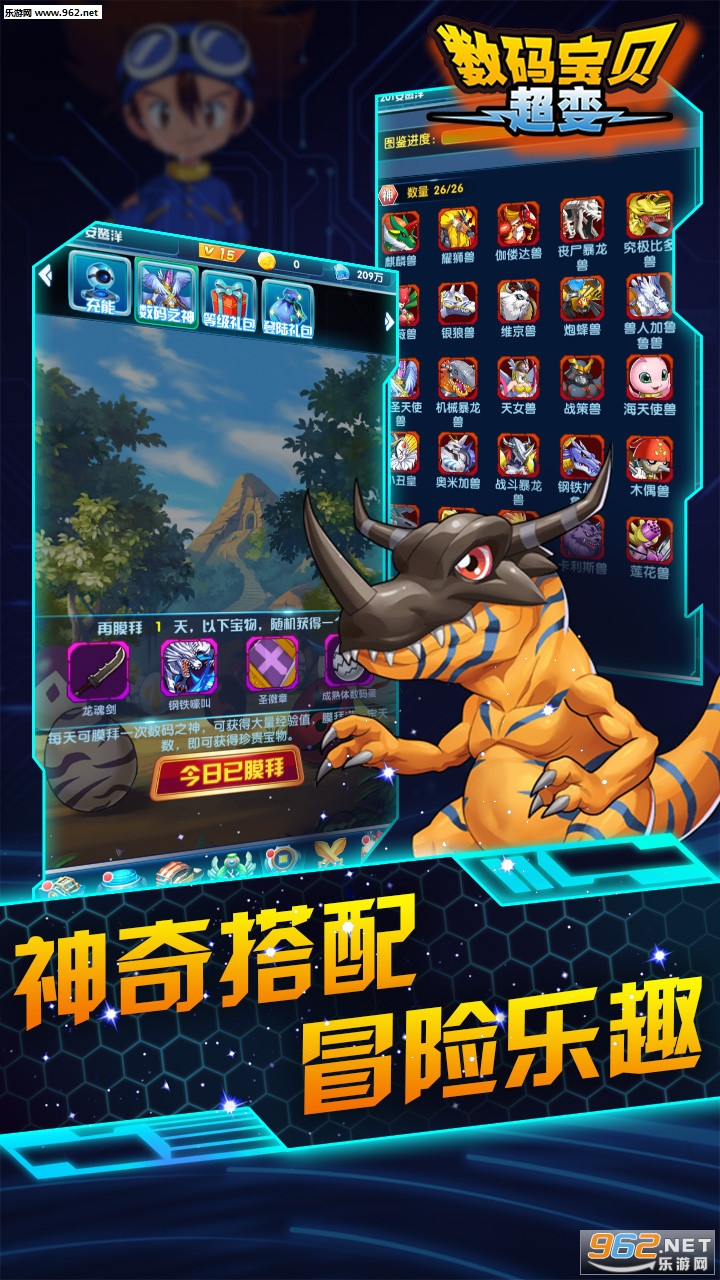 《最强宠物进化vr安卓版》是一款画面精致的以数码宝贝为题材打造的回合制策略卡牌游戏,游戏中玩家可以收集甲虫兽、暴龙兽等数码宝贝进行战斗,可以通过一些材料来让自己的宠物进化,进化为成熟体、完全体、究极体等,丰富的玩法可以体验。