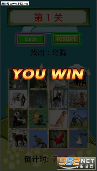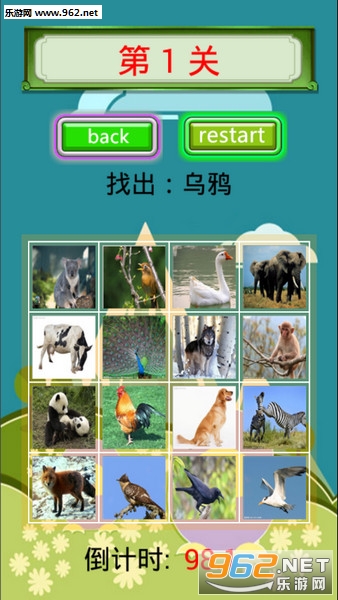 儿童找动物是一款很适合小孩子玩的一款休闲游戏,游戏中,宝宝必须在规定是时间里找到相同的动物,不可以选错哦,错了游戏就结束了,考验宝宝们的注意力,快来下载找找吧!