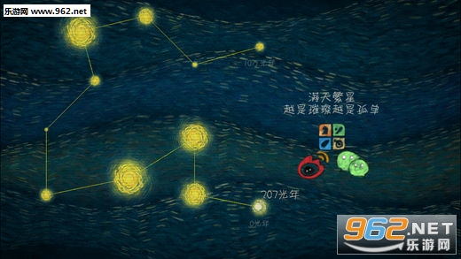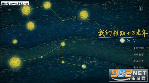 很唯美的游戏,游戏内容是点击白光使它到达黄星星,中间相距的距离是光年,总共光年就是你的成绩,玩家一共有三次机会,每次结束后都会有一句话。画面像梵高的油画,音乐很美很契合气氛。感觉像是作者思念另一个死去的人,因为据说人死去灵魂会变成星星,所以游戏里面说“你在我永远到不了的地方”“满天繁星,越是璀璨越是孤单。