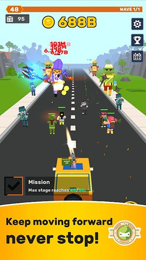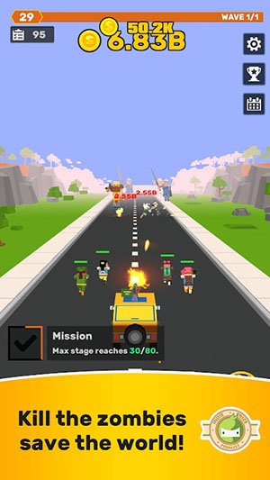 这是一个放置休闲游戏,你需要引导车队尽可能的和僵尸战斗