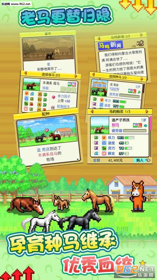 想要培育宝马良驹还少不了优质的训练设施与合理的孕育配种。在《赛马牧场物语》中,玩家可以不断拓展马场土地,增添各种各样的训练设施,让自己的赛马经过全方位训练得到最大化成长,还需要配置新嫩的草场和温泉为赛马减压或疗伤,放松赛马的心情。而每匹马都有自己的极限,想要突破极致培育超级赛马,就需要玩家参与马匹的配种,根据不同马匹的特性排列组合基因遗传,孕育优质战马。