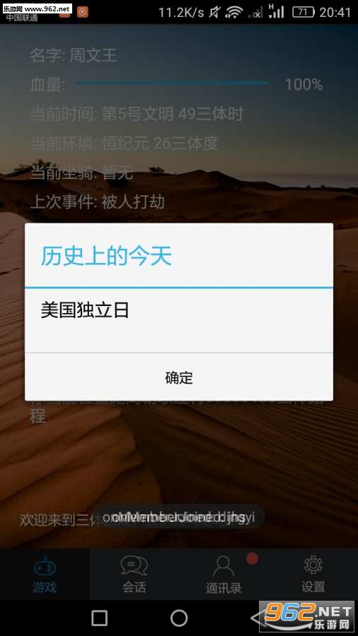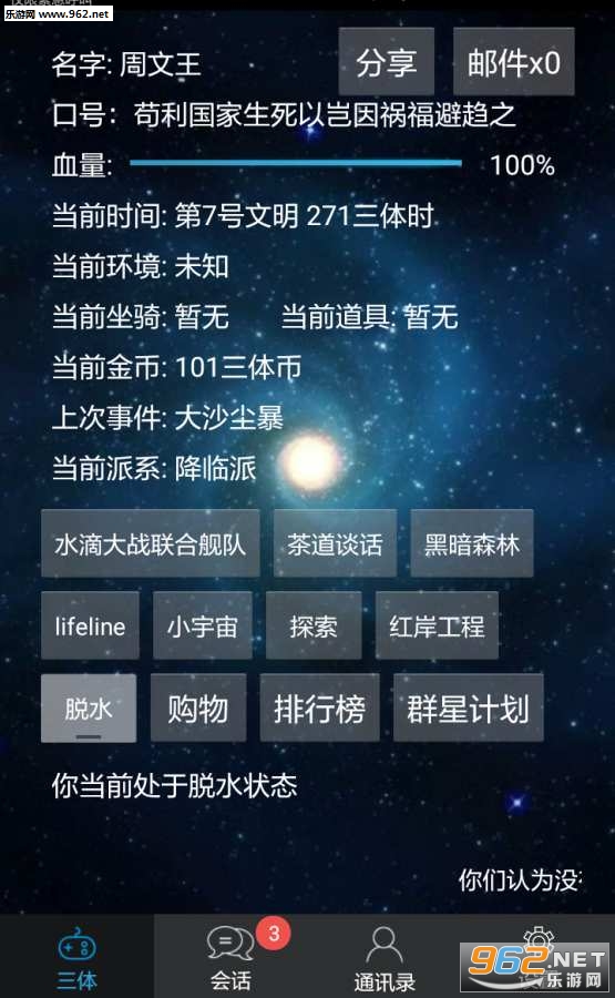 《三体模拟系统app》是一款以三体为题材制作的休闲手游,游戏虽然听起来比较高大上但是玩起来还是很亲民的,以文字剧情玩法为主,可以让玩家轻松上手。另外开发者真的非常注重玩家的游戏以及社交体验,直接在内部就设置了会话板块,在这里你不仅可以和群里的玩家进行交流,还能对作者提出各种bug以及建议。感兴趣的话就快来下载吧!