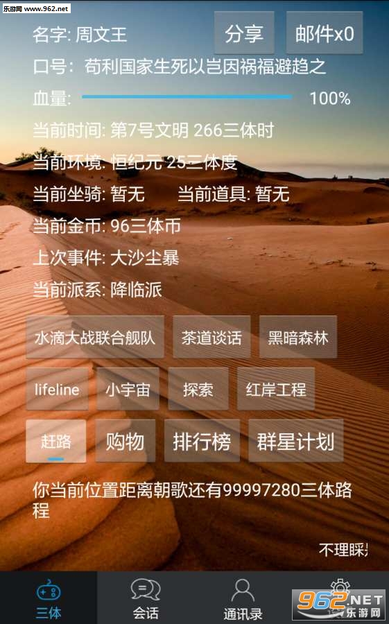 游戏的玩法很简单,看谁能够赶到朝歌。目前做的还不算尽善尽美,也不像《三体》中描述的那样是一款VR游戏,但我尽我所能使热爱《三体》的朋(P)友(Y)感受到游戏的乐趣。也可以在个人主页体验“捐款”功能,欢迎各位尽情的体验“捐助”功能。如果觉得游戏内交流不方便,可以在手机点击右下角加入群组一起讨论。