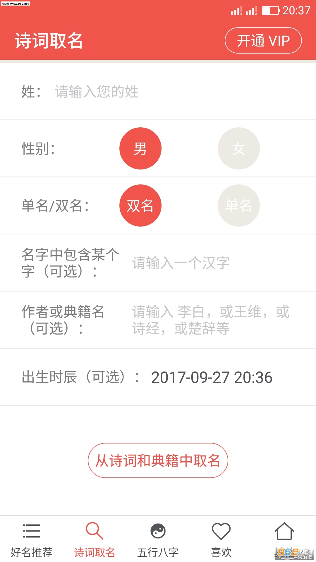 诗词取名页面,根据姓氏,性别,生辰八字,喜欢的字,喜欢的诗词作者和古籍名等,精选名字提供给用户选择。