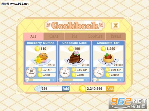 说到食谱,其实游戏并没有在创造方式上用更加灵活的形式来展现,依然是以解锁和一键购买这种一气呵成的方式来更新菜单。不过消费者似乎不会介意这么多,只要玩家能够提供足够多花样的蛋糕,并且保证供给量,就可以获得好评。而游戏所提供的食谱,不但有着可口的色泽搭配,样式也非常齐全,想要都学会也得经过一段过程。
