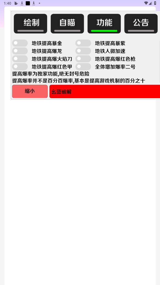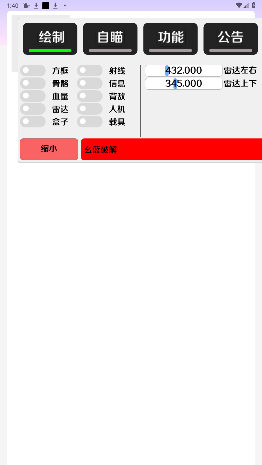 绘制功能:通过精准的绘制技术,将游戏内的敌人、物资等关键信息以直观的方式呈现在屏幕上,帮助玩家快速发现目标。