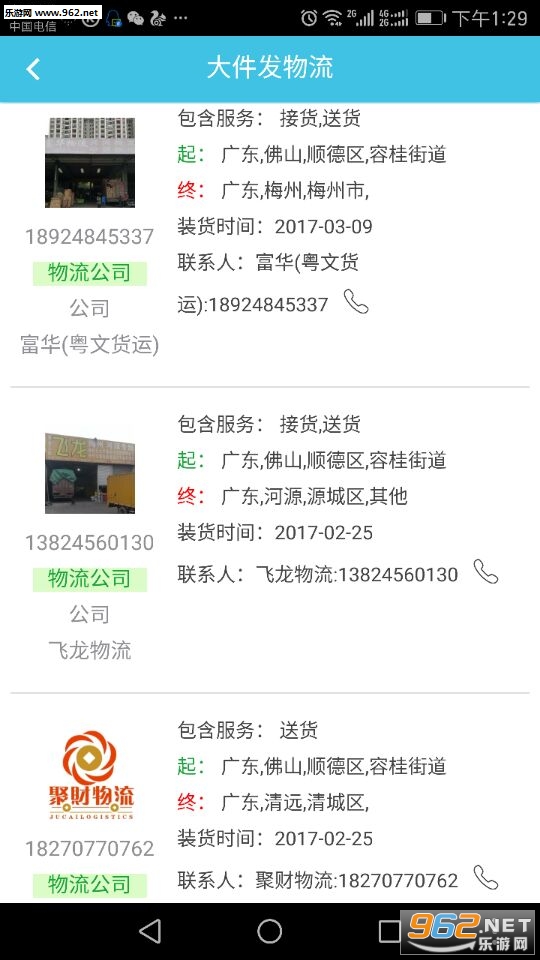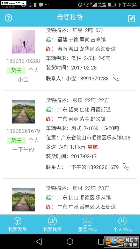 5、我要找货,为货车司机快速找到附近的货源,减少司机放空车回程的成本(通地发货地和到达地查询货车回程线路的货源,手机APP有导航货源地的地址,选择较近的货源地到现场洽谈,或电话拨打功能联系货主洽谈)。物流公司也适用(通过发货地或者物流公司的货车经过货主的发货地,到达地相同或附近。也减少物流公司的运输成本,也达到快速发货)
