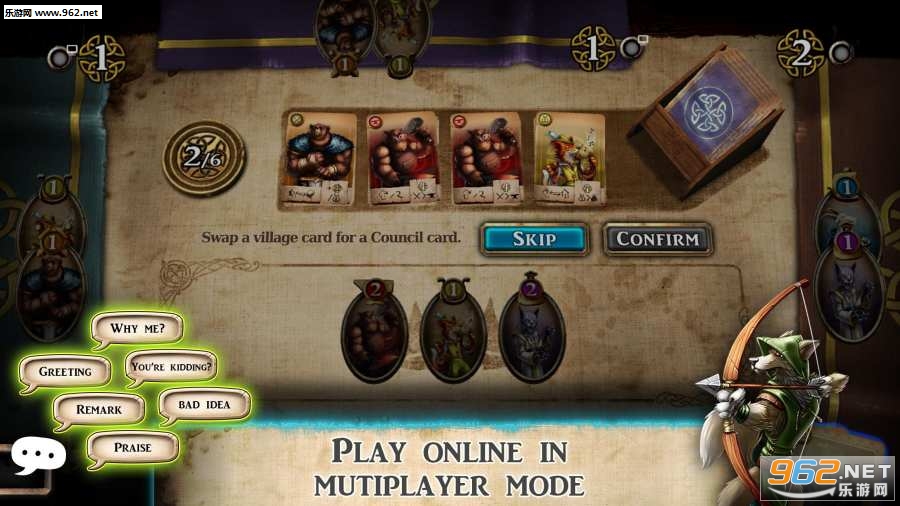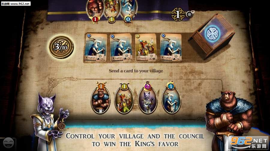 在游戏结束时,玩家村中的每张卡片都与同一张卡片在国王委员会中出现的次数相同。在您的村庄和议会中都能聪明地玩耍,不要忘了注意对手的村庄,以赢得胜利。