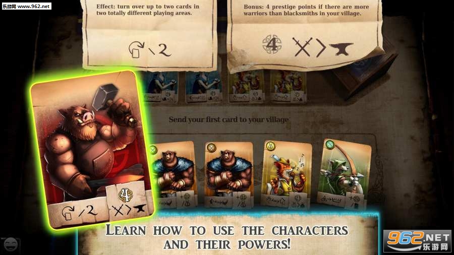 《哈拉尔德中文版》是一款多人卡片对战游戏,每一张卡片都有不同的功能,狼/侦察兵,天猫/商人,狐狸/吟游诗人,熊/战士,山羊/海员;野牛/铁匠等为六个字符,合理的运用字符获得最大的点数,开始可能会摸不着头脑,多玩几盘就会了解了。