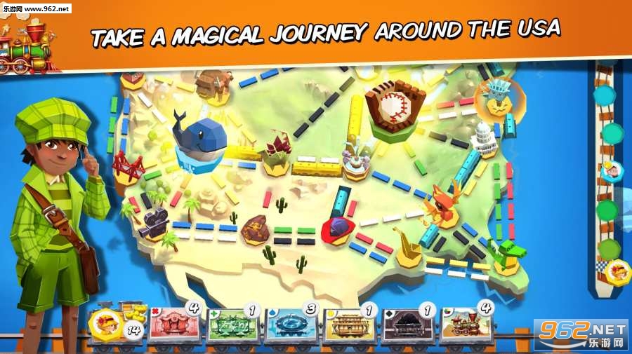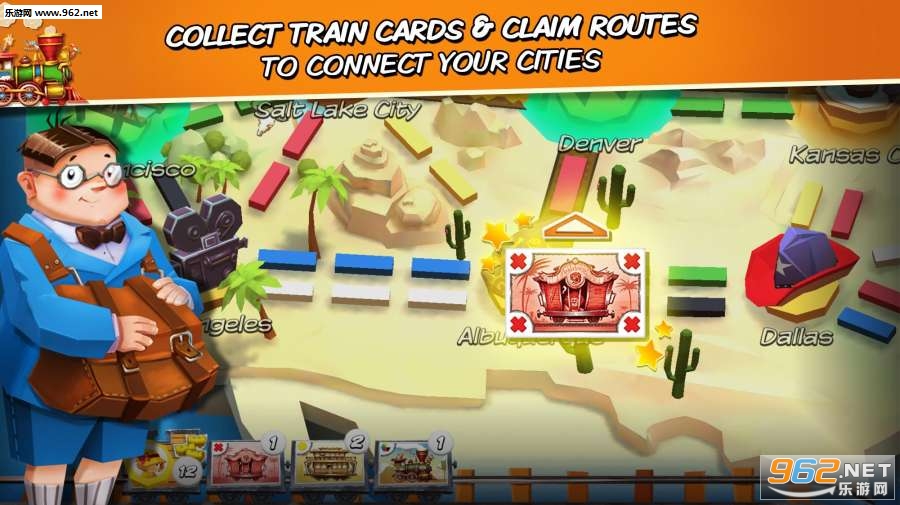 收集列车卡,在地图上标出路线,并尝试连接在车票上显示的城市。每个玩家从四张彩卡和两张票开始。每张票上都有两个城市,目的是为了把这两个城市连接到你的火车上,以完成车票。
