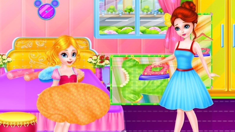 这位年轻的妈妈今天真的是太累了,她太需要休息了。你愿意帮助她去做一些房间的清洁工作吗? 去做她的小助手把卧室,客厅,厨房都打扫干净。将所有的垃圾清理掉并且修好客厅的空调。之后,你就可以美美的装扮这位可爱勤劳的小姑娘啦。