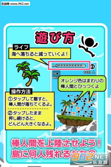 游戏的操作也很无脑,只要点击画面上的空白区域就能够空降下火柴人。已经放置火柴人的地方就没法再放了,不过有的时候却可以在隙缝中硬塞进一只,不过简单归简单,一旦玩家有10个火柴人掉进海里就立刻Gameover。