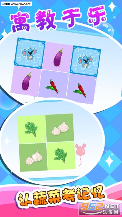 拖拖乐:也是考查宝宝是否认识了这些动物一种方式,通过把上方的蔬菜卡片拖到对应的相框中来通过关卡。